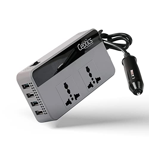 Ceptics 200W Car Laptop Charger/Power Inverter with Digital Display and SmartVoltage™ Technology – 12V DC to 220V AC, 9.6A Quad USB with QC3.0-2X Universal AC Outlet – Grey Color – 18 Months Warranty